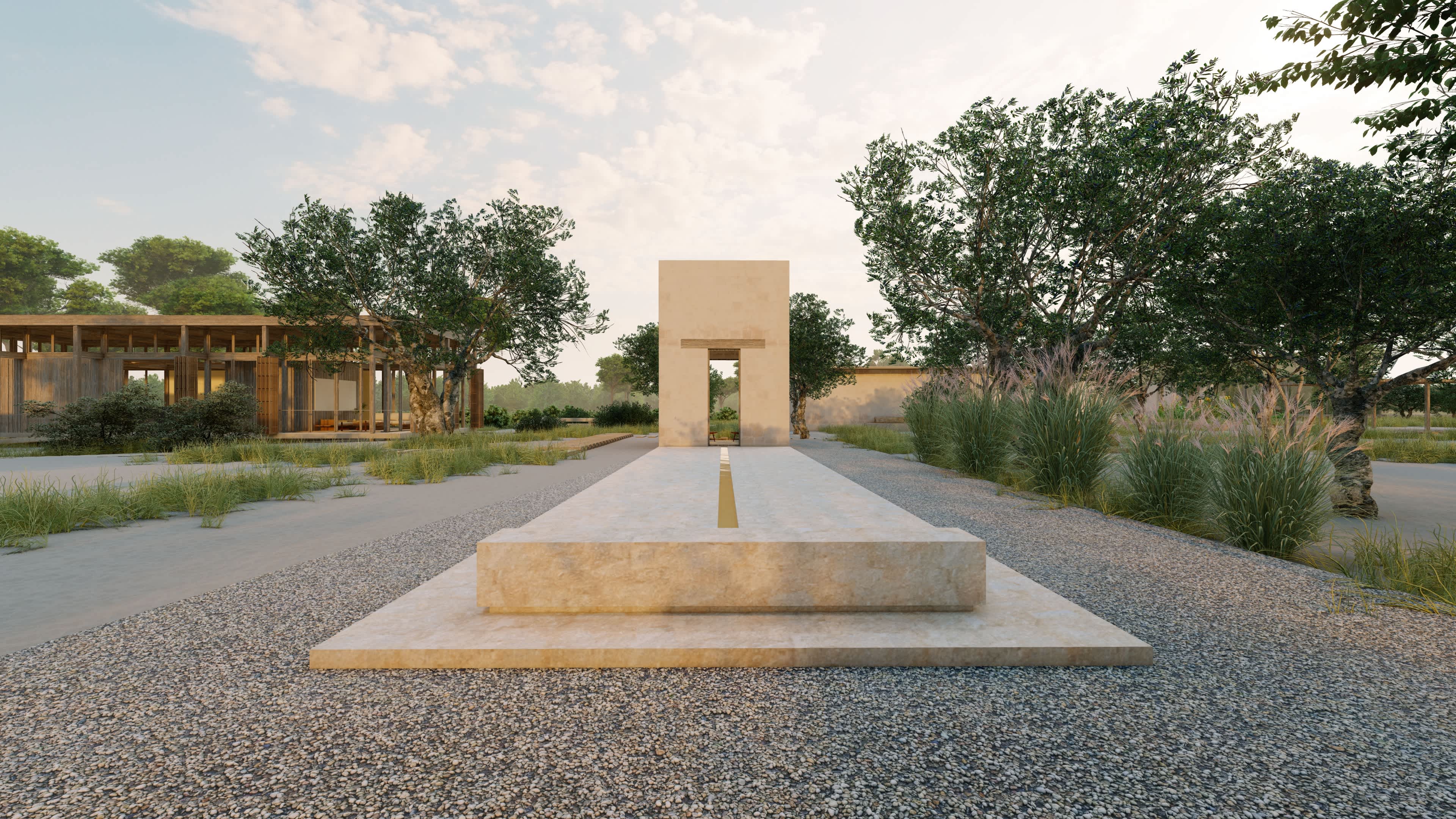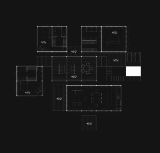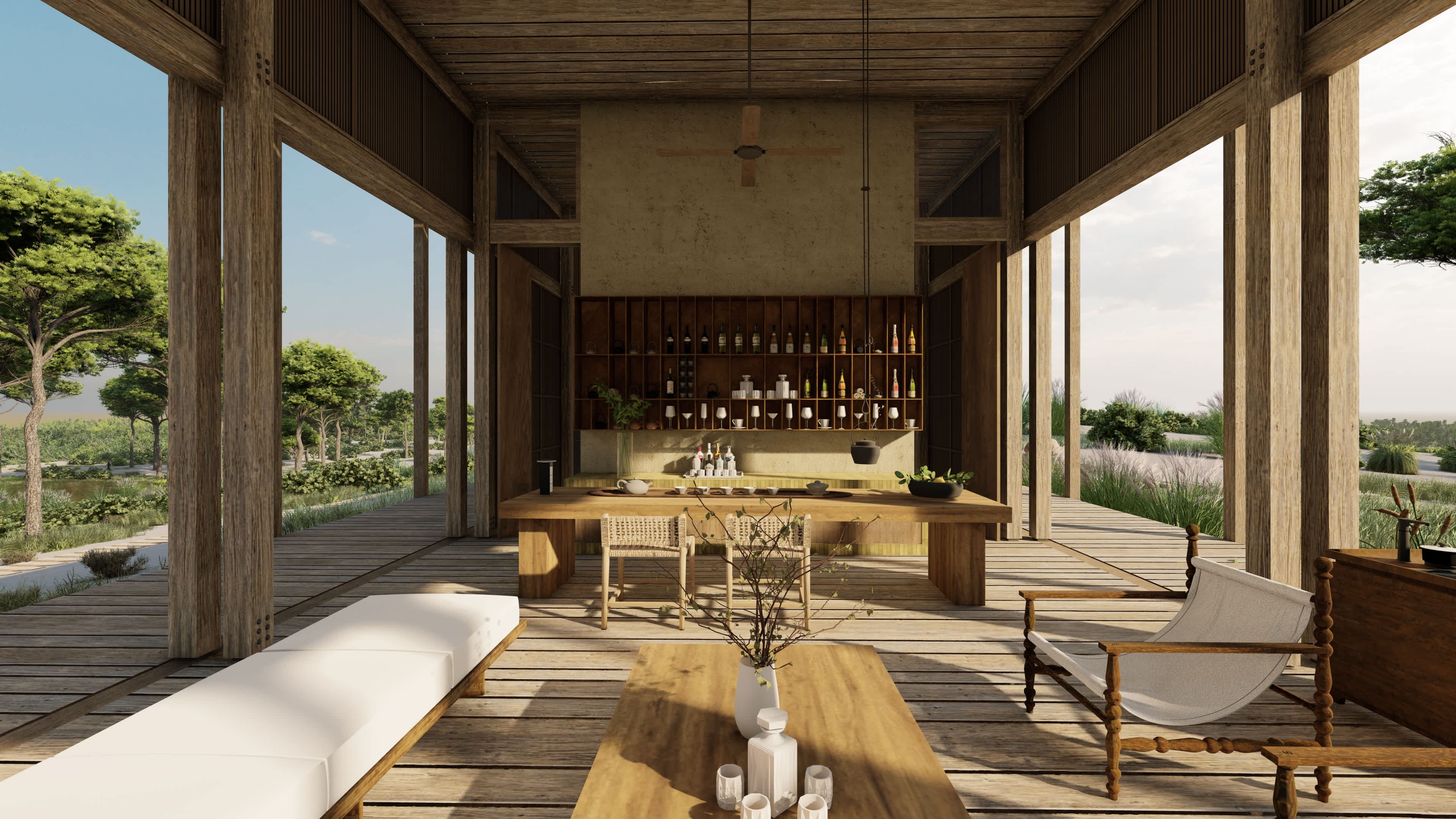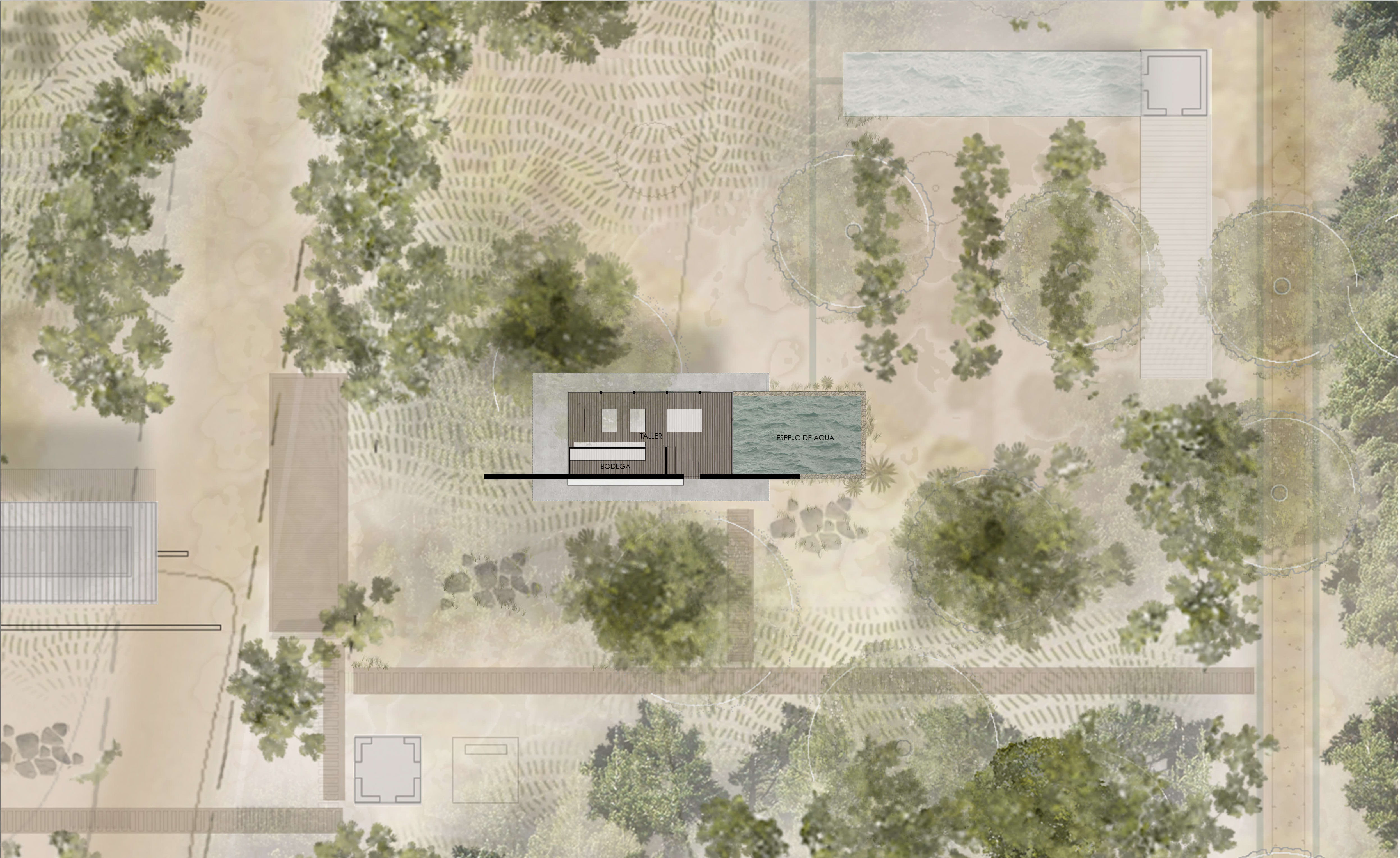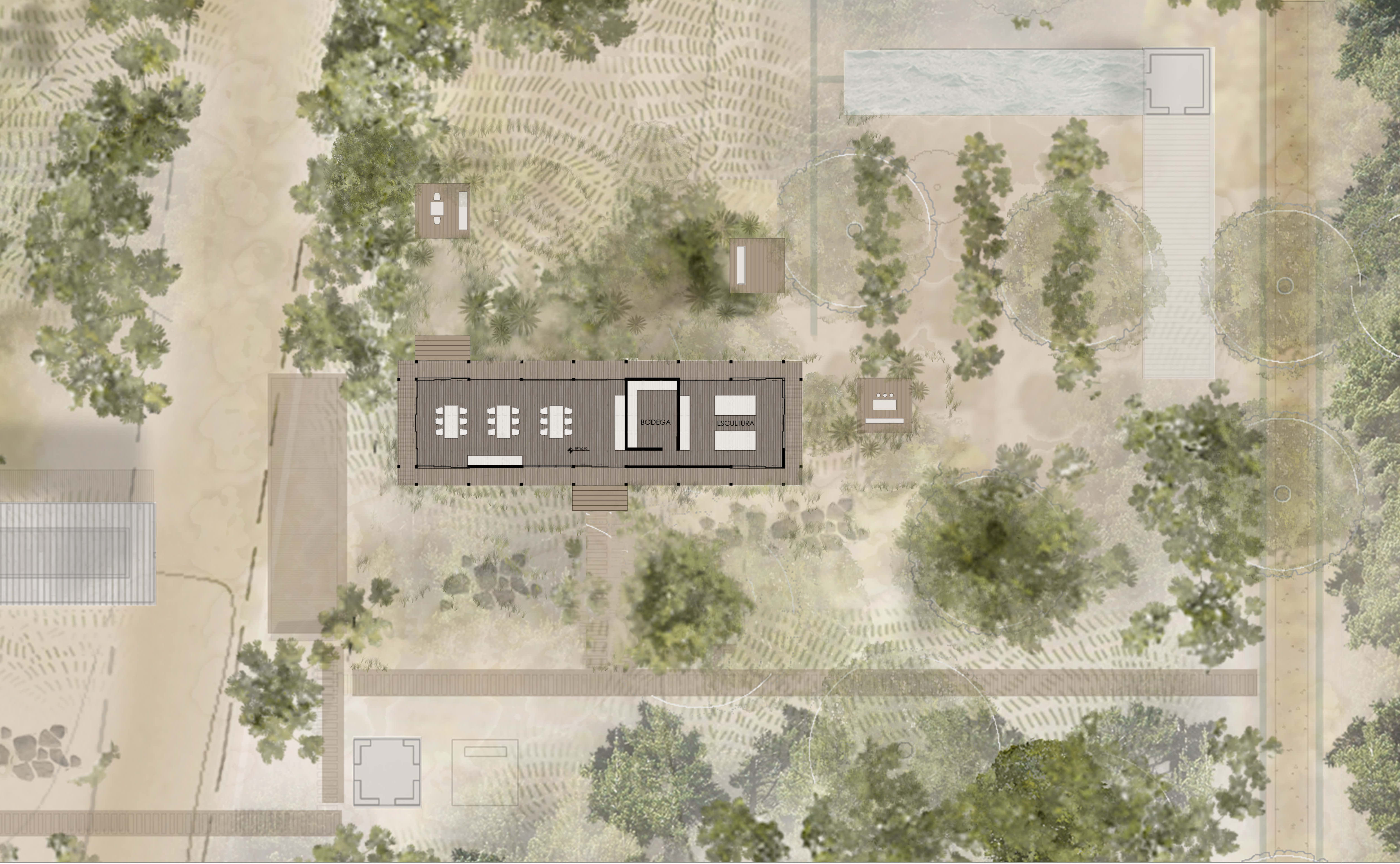 La institución de arte y la residencia privada del cliente se ubican en extremos opuestos de la parcela, conectados por un muelle central y senderos naturales. Esta estrategia preserva la privacidad de ambos programas, manteniendo un lenguaje estructural conjunto: madera para los espacios habitacionales y sillares de piedra para las áreas de servicio.