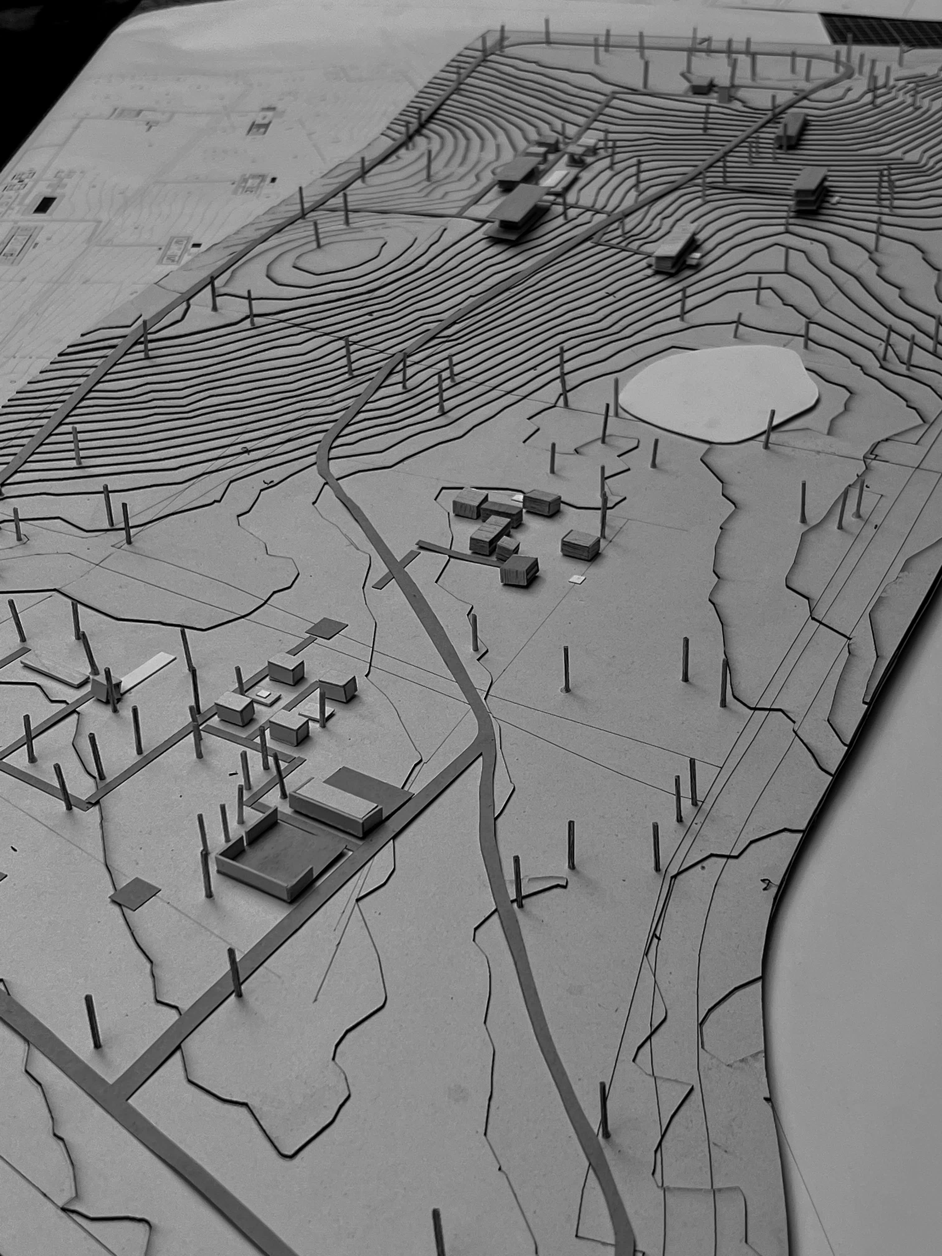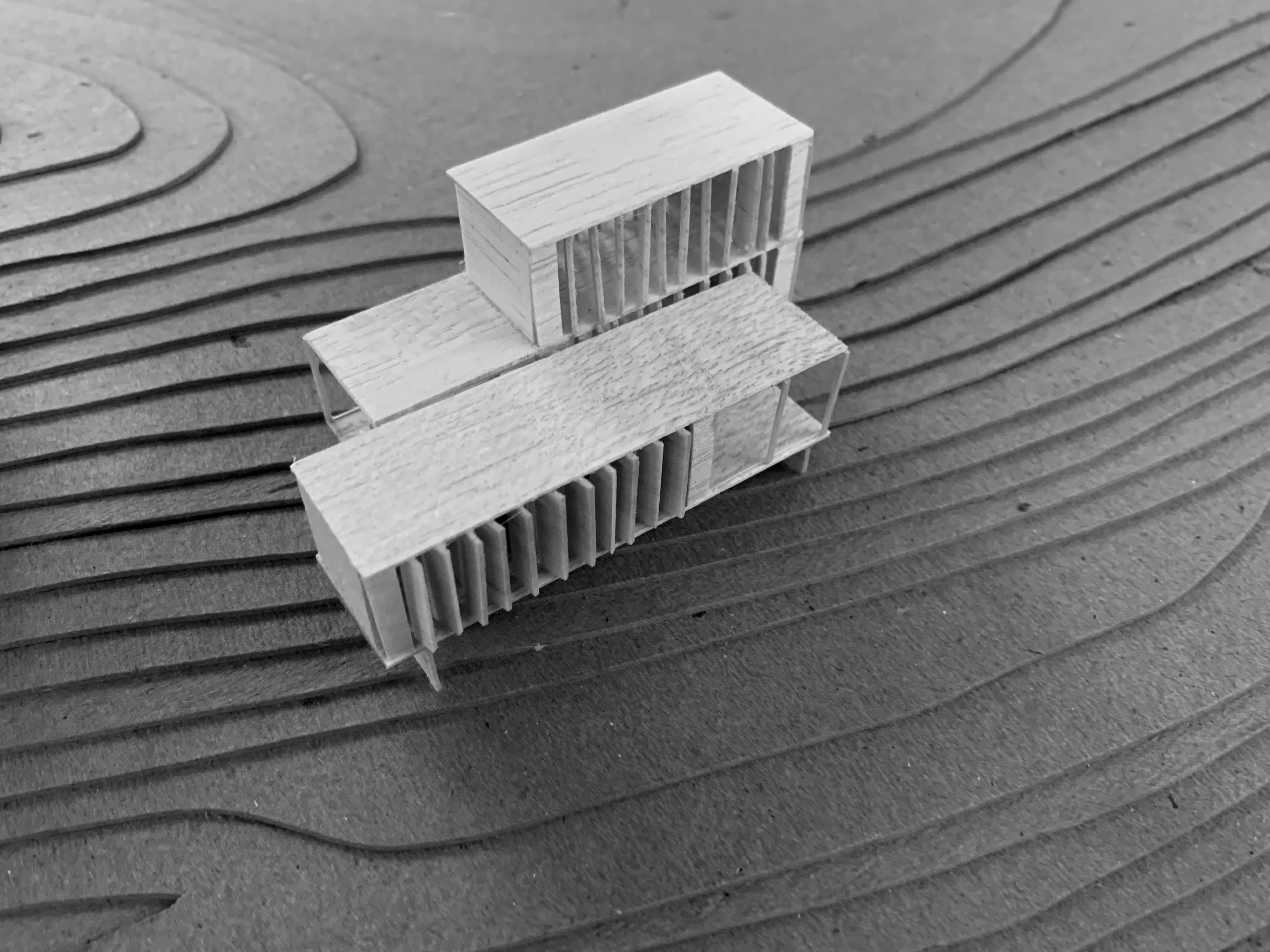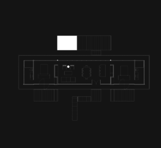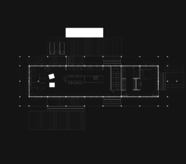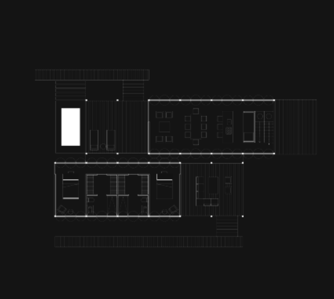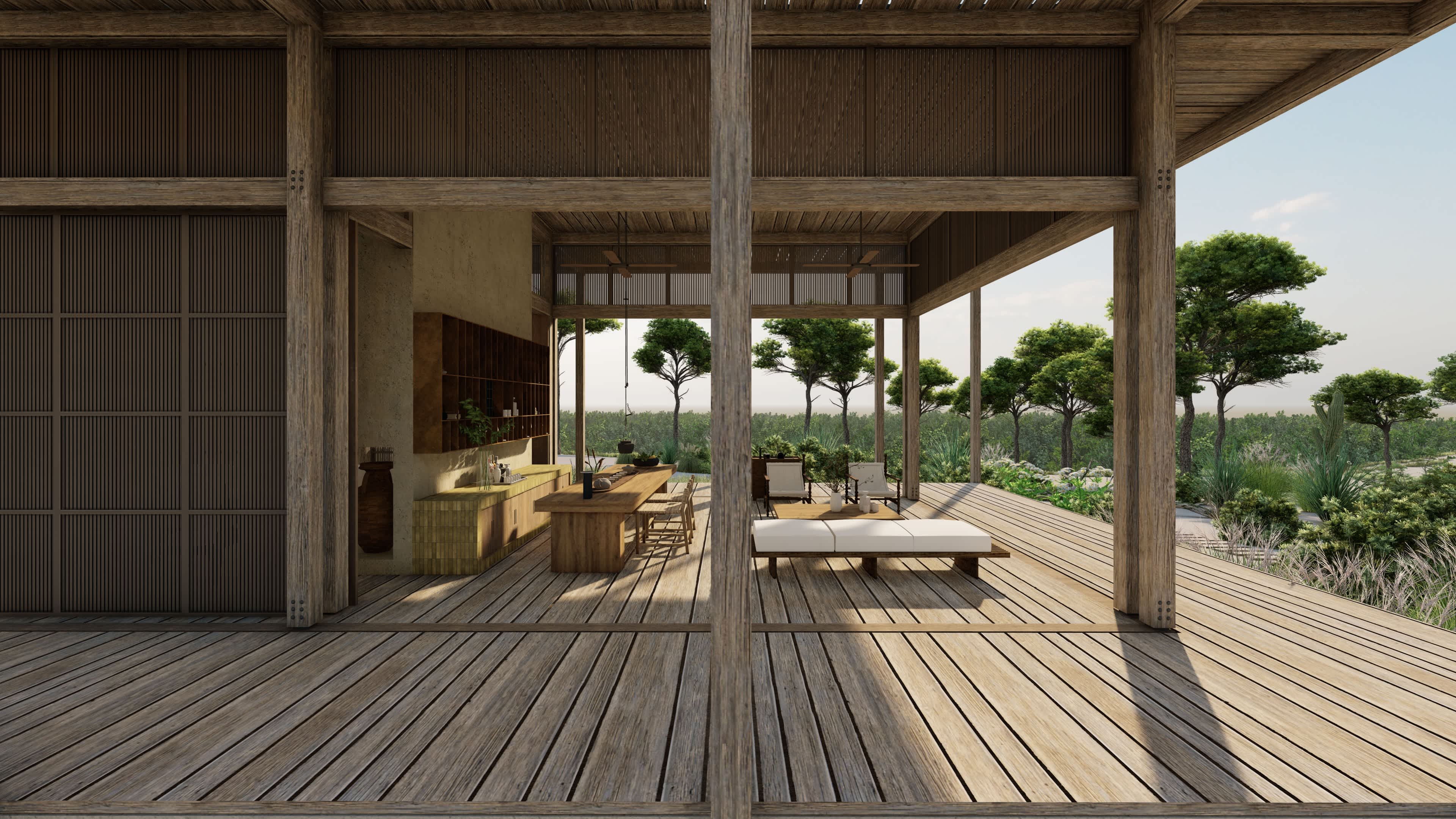 La institución de arte y la residencia privada del cliente se ubican en extremos opuestos de la parcela, conectados por un muelle central y senderos naturales. Esta estrategia preserva la privacidad de ambos programas, manteniendo un lenguaje estructural conjunto: madera para los espacios habitacionales y sillares de piedra para las áreas de servicio.