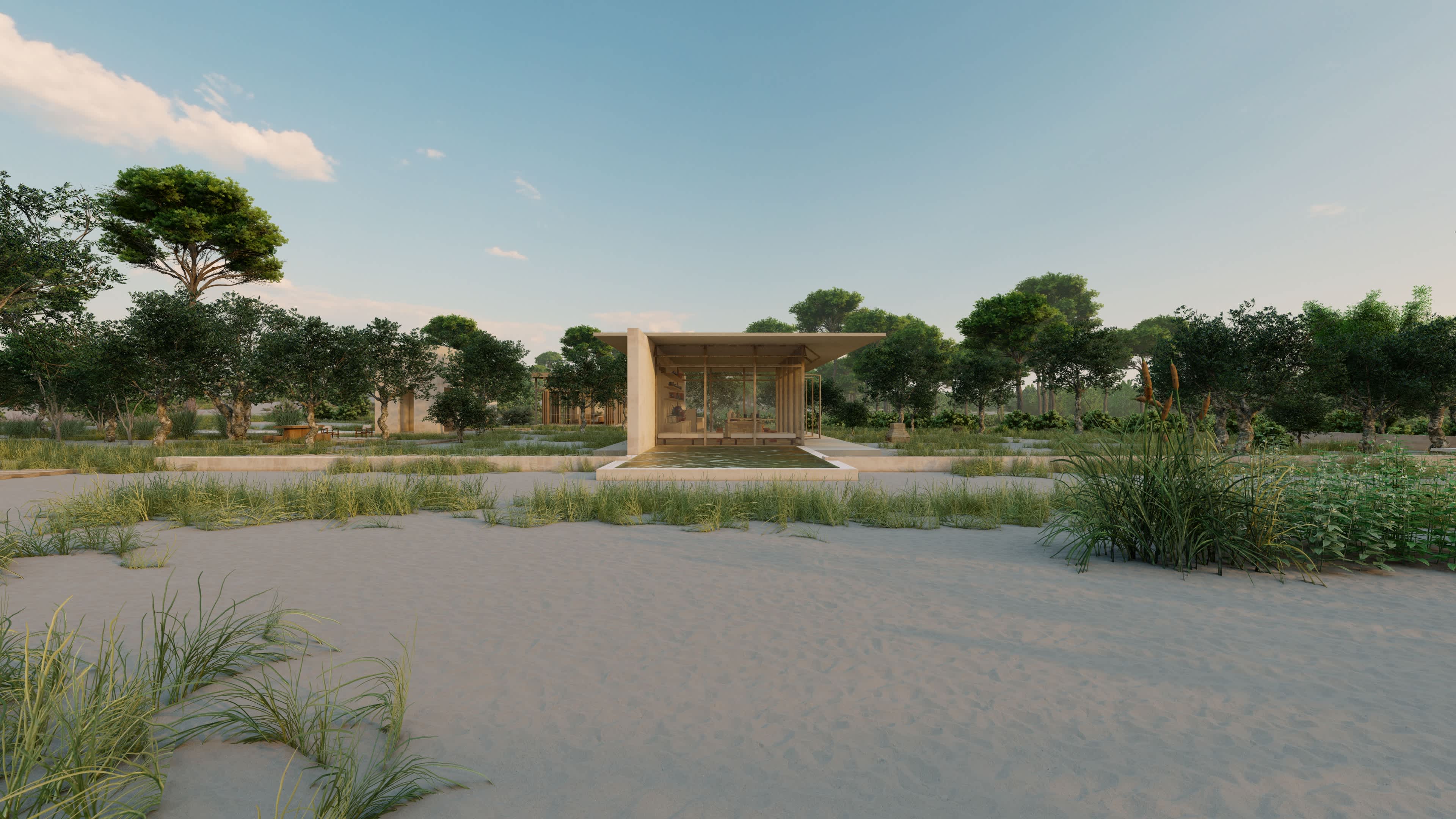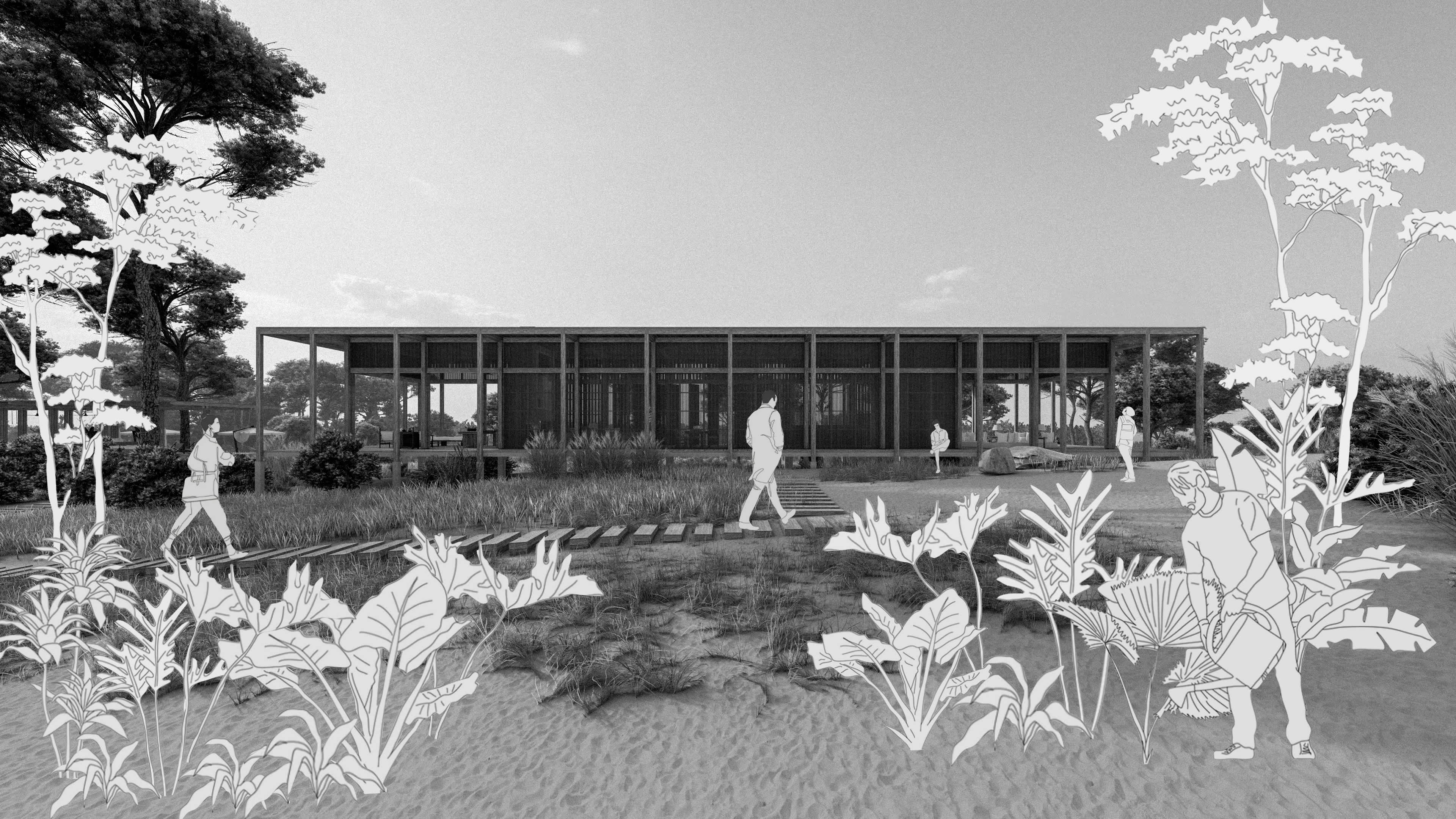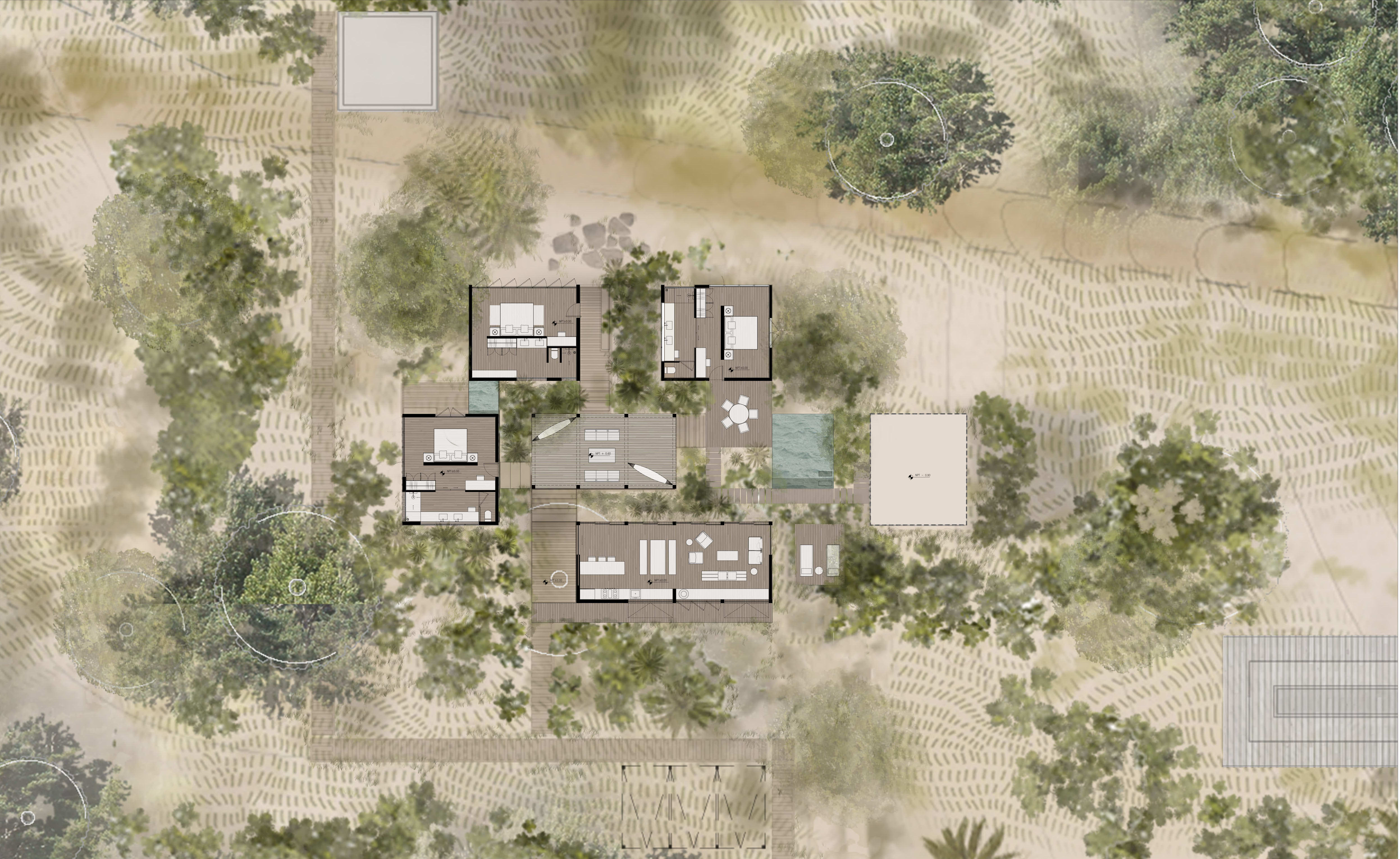 El proyecto propone una secuencia de agrupaciones formadas por estrategias programáticas para coexistir con el entorno existente. Plataformas, pabellones y bungalows se convierten en límites del paisaje, volúmenes que se abren hacia el exterior en celebración de la naturaleza. La calma se percibe en la relación entre sus elementos y texturas.