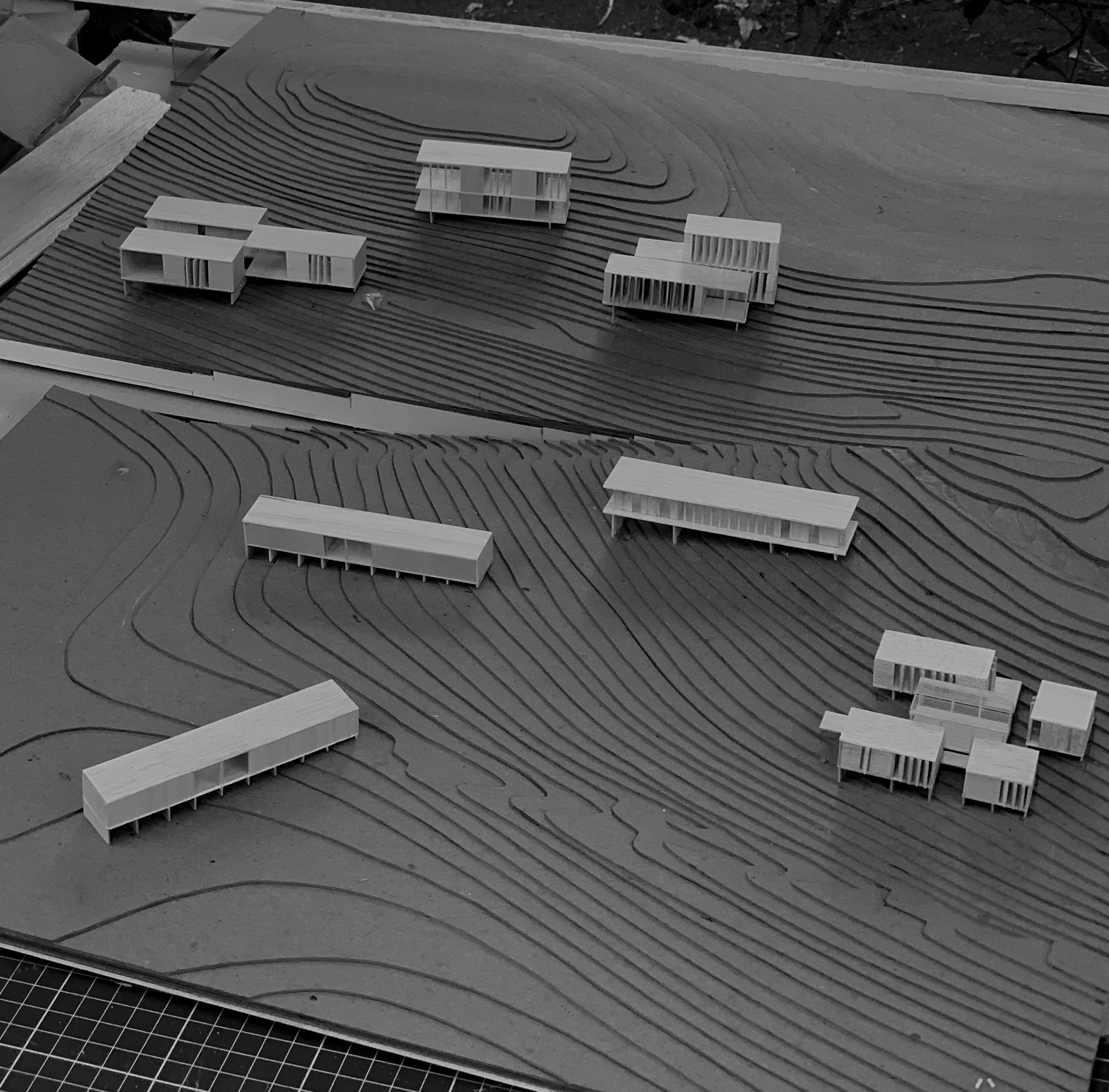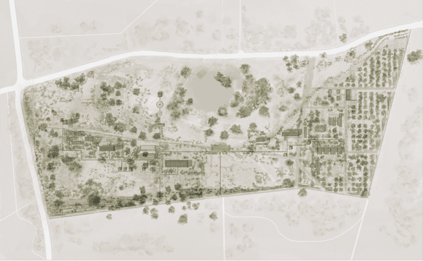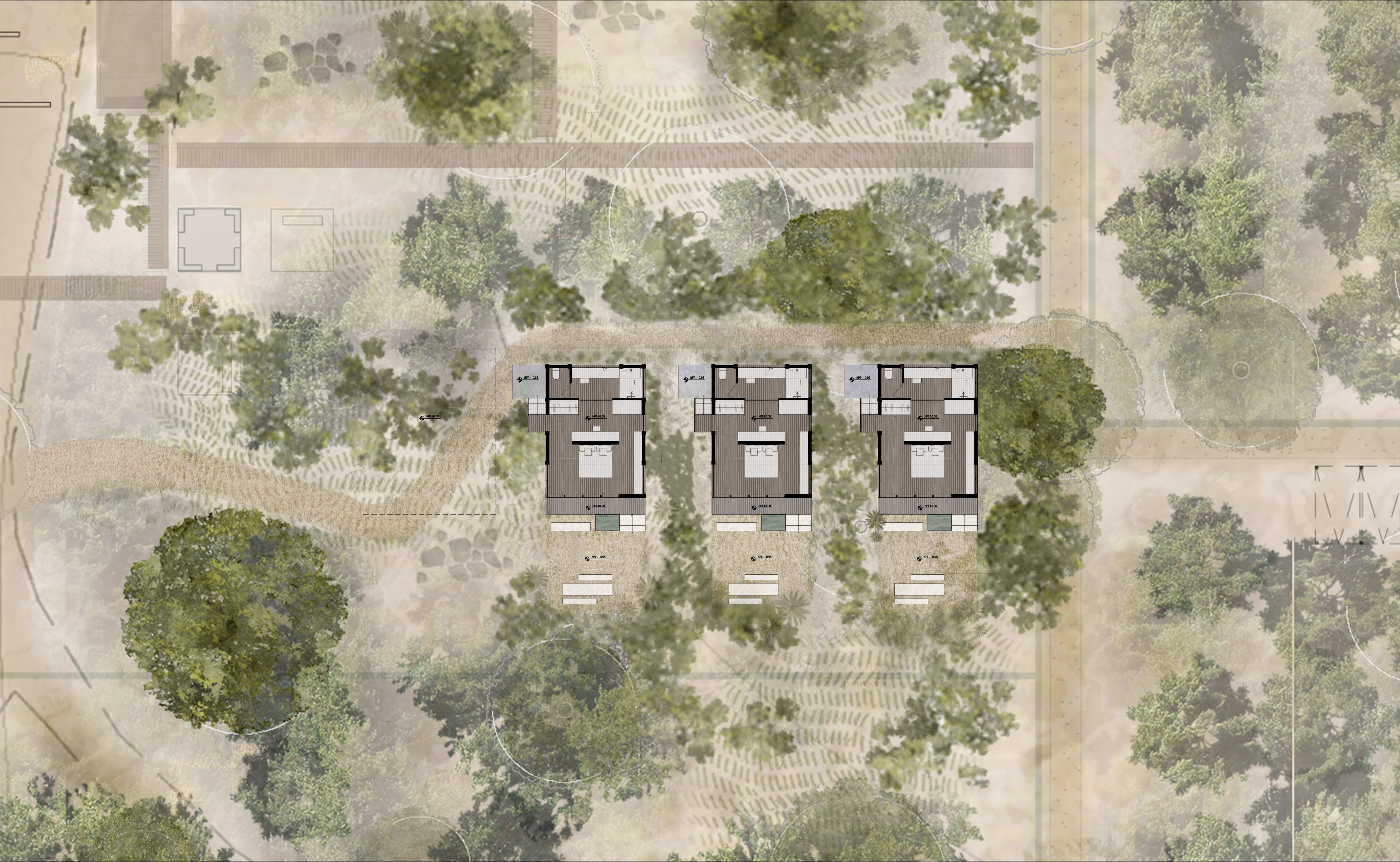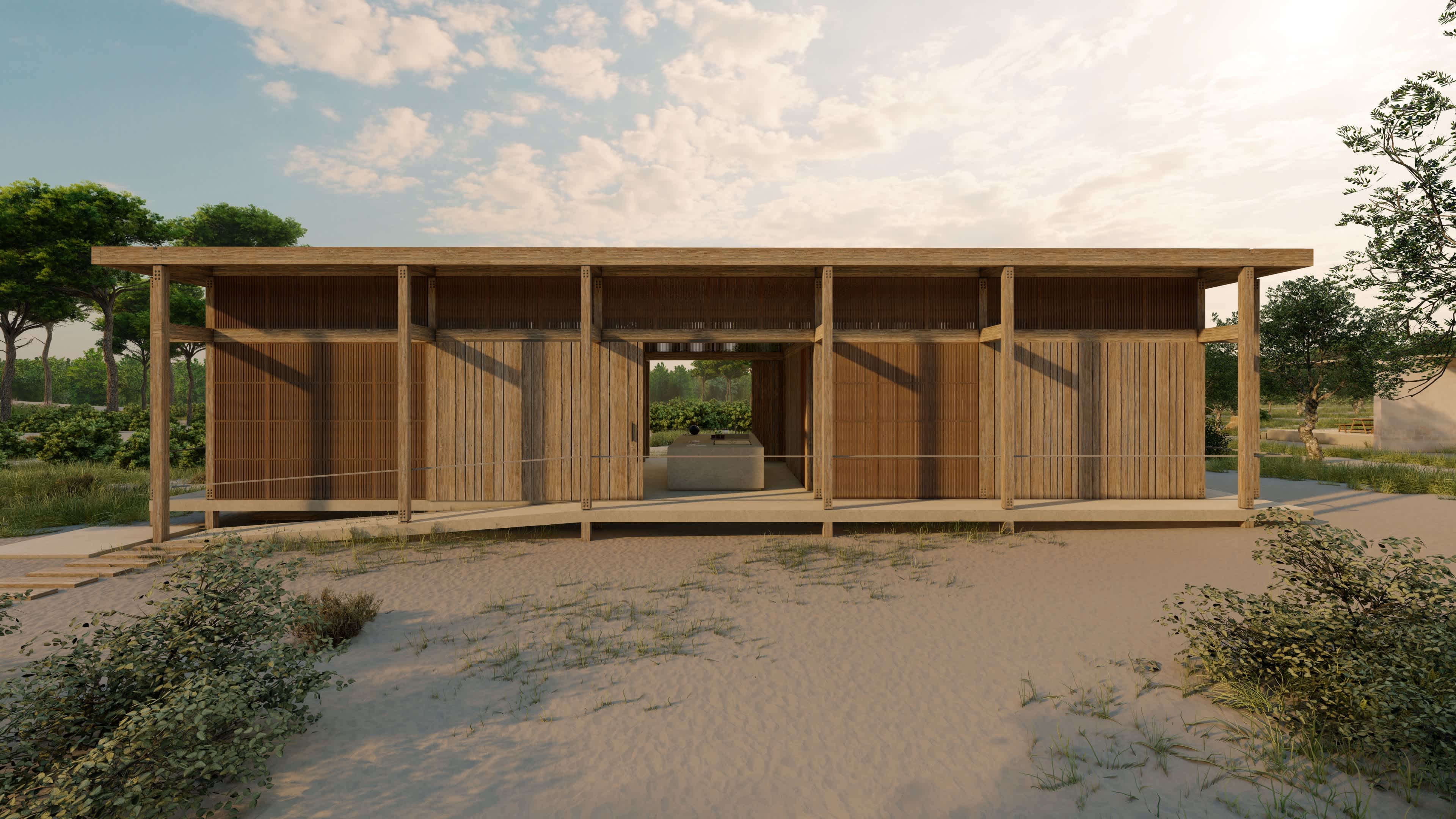 El proyecto propone una secuencia de agrupaciones formadas por estrategias programáticas para coexistir con el entorno existente. Plataformas, pabellones y bungalows se convierten en límites del paisaje, volúmenes que se abren hacia el exterior en celebración de la naturaleza. La calma se percibe en la relación entre sus elementos y texturas.